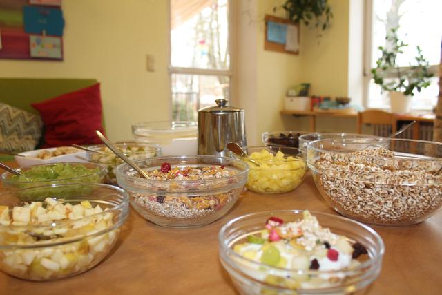 In der Kindertageseinrichtung bekommen unsere Kinder eine Vollverpflegung. Am Vormittag gibt es eine gleitende Brotzeit. Die Kinder dürfen sich ihre Brotzeit selber nehmen und zubereiten. Das Mittagessen wird in unserer hauseigenen Küche frisch gekocht. Da wir in unserer eigenen Küche täglich frisch kochen, können wir gesundheitsbedingte (Allergien, Unverträglichkeiten), kulturelle und religiöse Ernährungsbedarfe berücksichtigen. Den Kindern stehen in ihren Gruppenräumen und im Garten jederzeit Getränke zur Verfügung. Zudem nehmen wir am Projekt „EU-Schulprogramm-Obst und Gemüse“ teil und werden einmal wöchentlich mit biologisch angebautem Schulobst beliefert. Wir achten bei der Auswahl und Zusammenstellung der Speisen auf Frische und Ausgewogenheit. Dabei orientieren wir uns an dem „Qualitätsstandard für Verpflegung in Tageseirichtungen für Kinder“ der Deutschen Gesellschaft für Ernährung (DGE) und den „Bayerischen Leitlinien Kitaverpflegung“ des Bayerischen Staatsministeriums für Ernährung, Landwirtschaft und Forsten